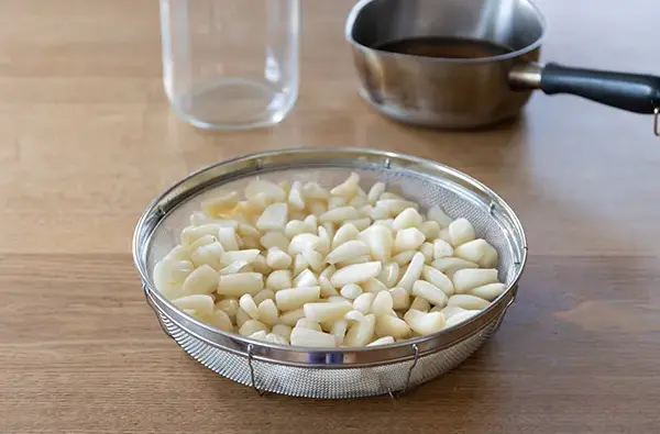 甘酢の材料を鍋に入れ、煮立たせて冷ましておく洗いらっきょを軽く洗うざるに広げ、沸騰したお湯を回しかける水をよくきり、自然に乾かす保存瓶にらっきょを 入れ、甘酢を注ぎ入れる1~2週間で食べごろに